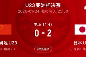 体育资讯01月24日讯 U23亚洲杯决赛,U23国足半场0-2暂时落后日本队。与此同时开球的英超比赛,曼城半场2-0领先狼队。