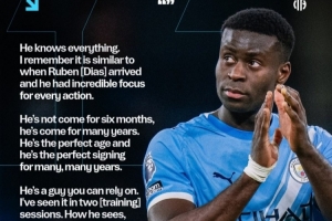 瓜迪奥拉说道:“他知晓一切,我记得这和鲁本·迪亚斯刚来时很像,他对每一个动作都有着令人难以置信的专注。”